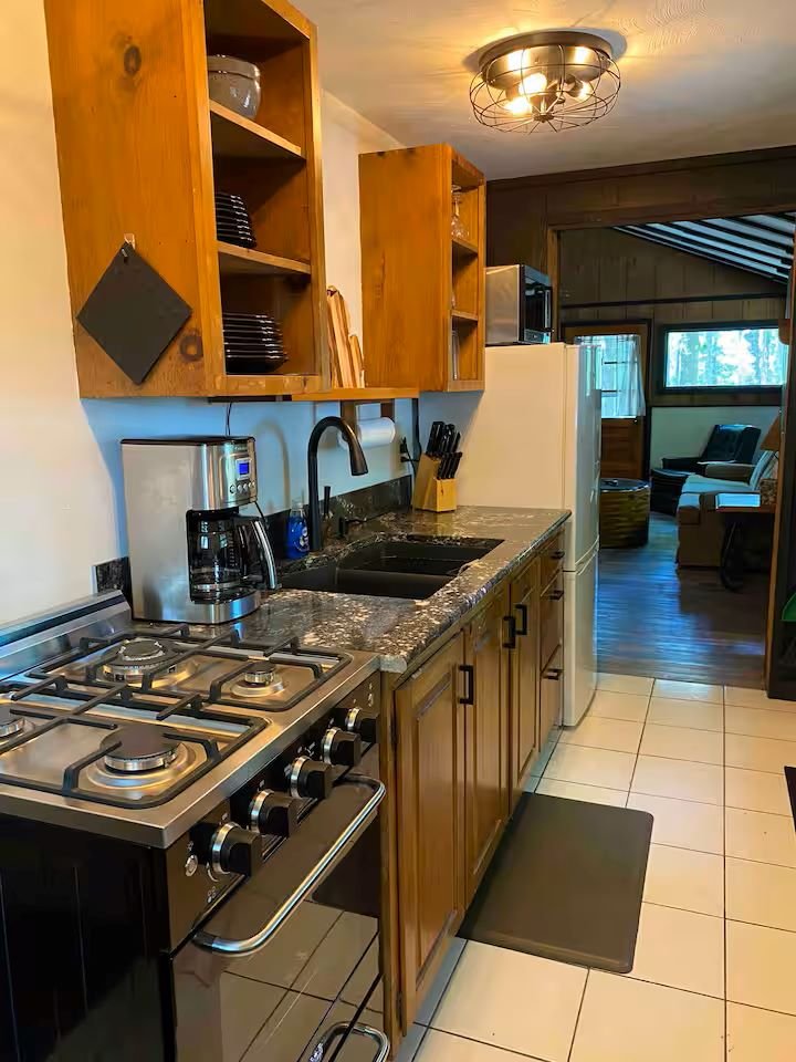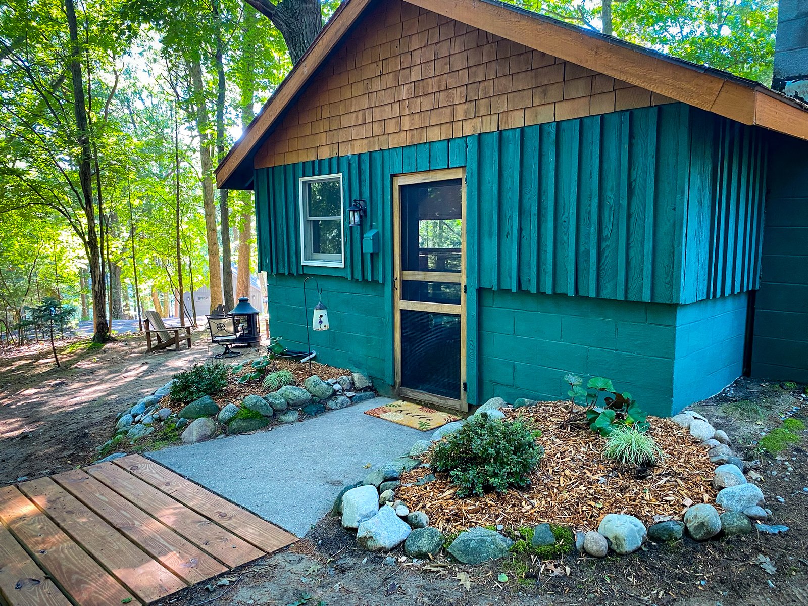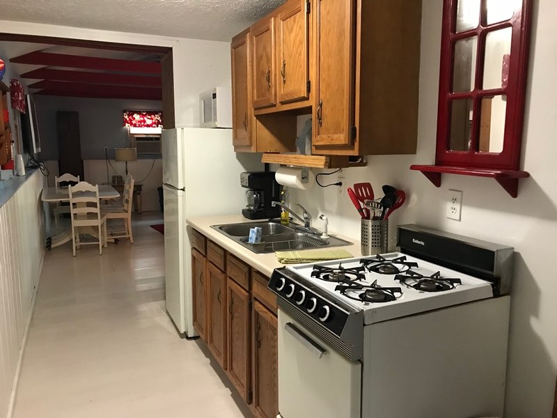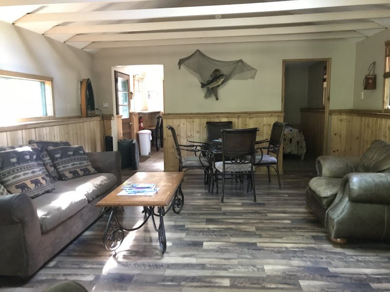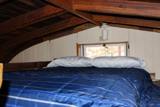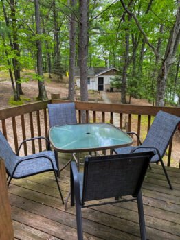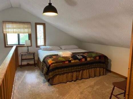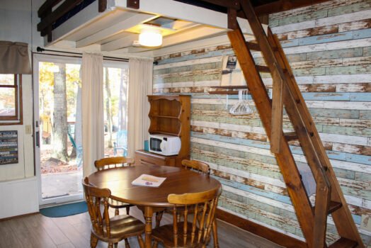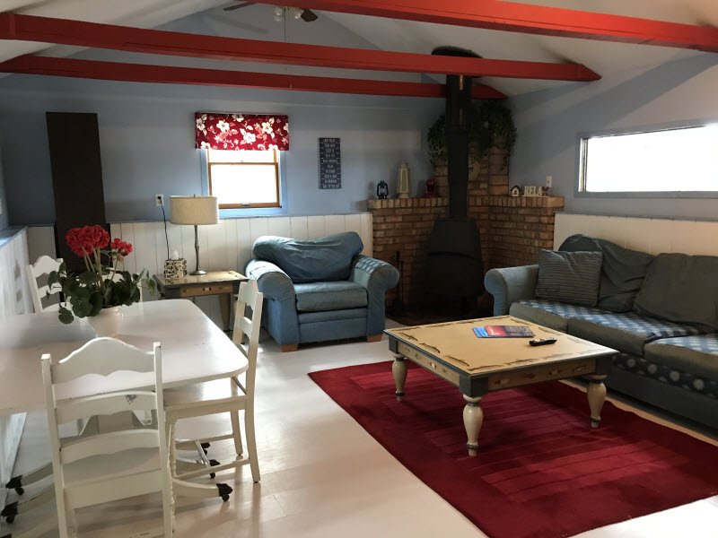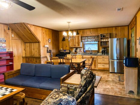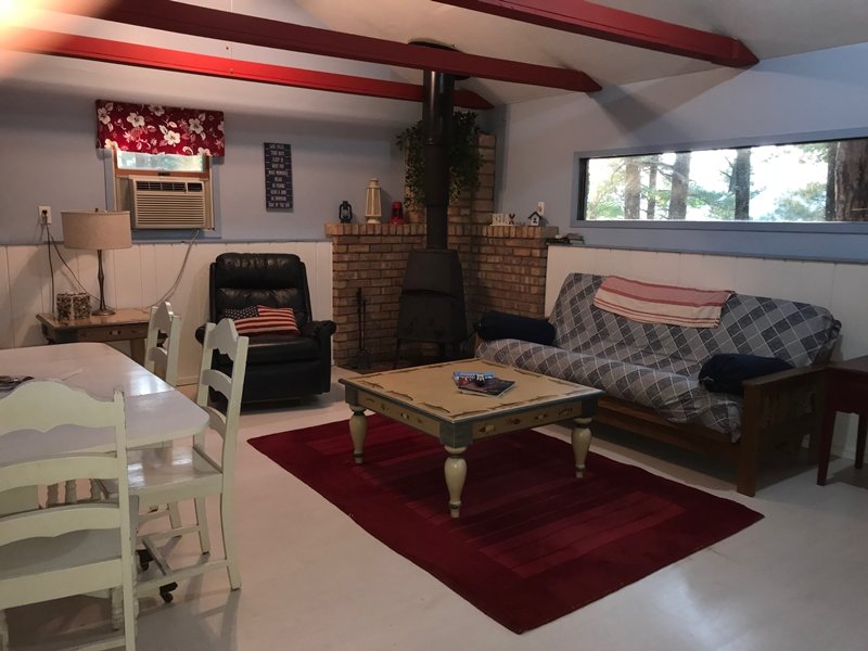 Cute and cozy, yet very spacious with air conditioning. Enters into the living room with Queen bed and wood burning stove. Eat-in kitchen with double size loft bed above. Bathroom with shower. Sliding glass doors off kitchen lead to the patio with picnic table, grill, and private fire pit. Approximately 350 feet from the lake.