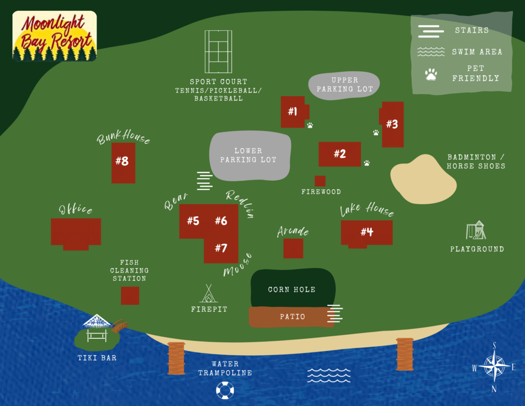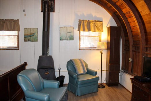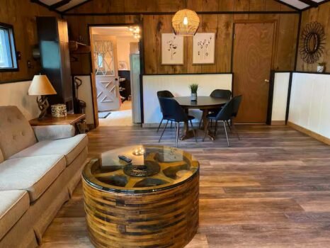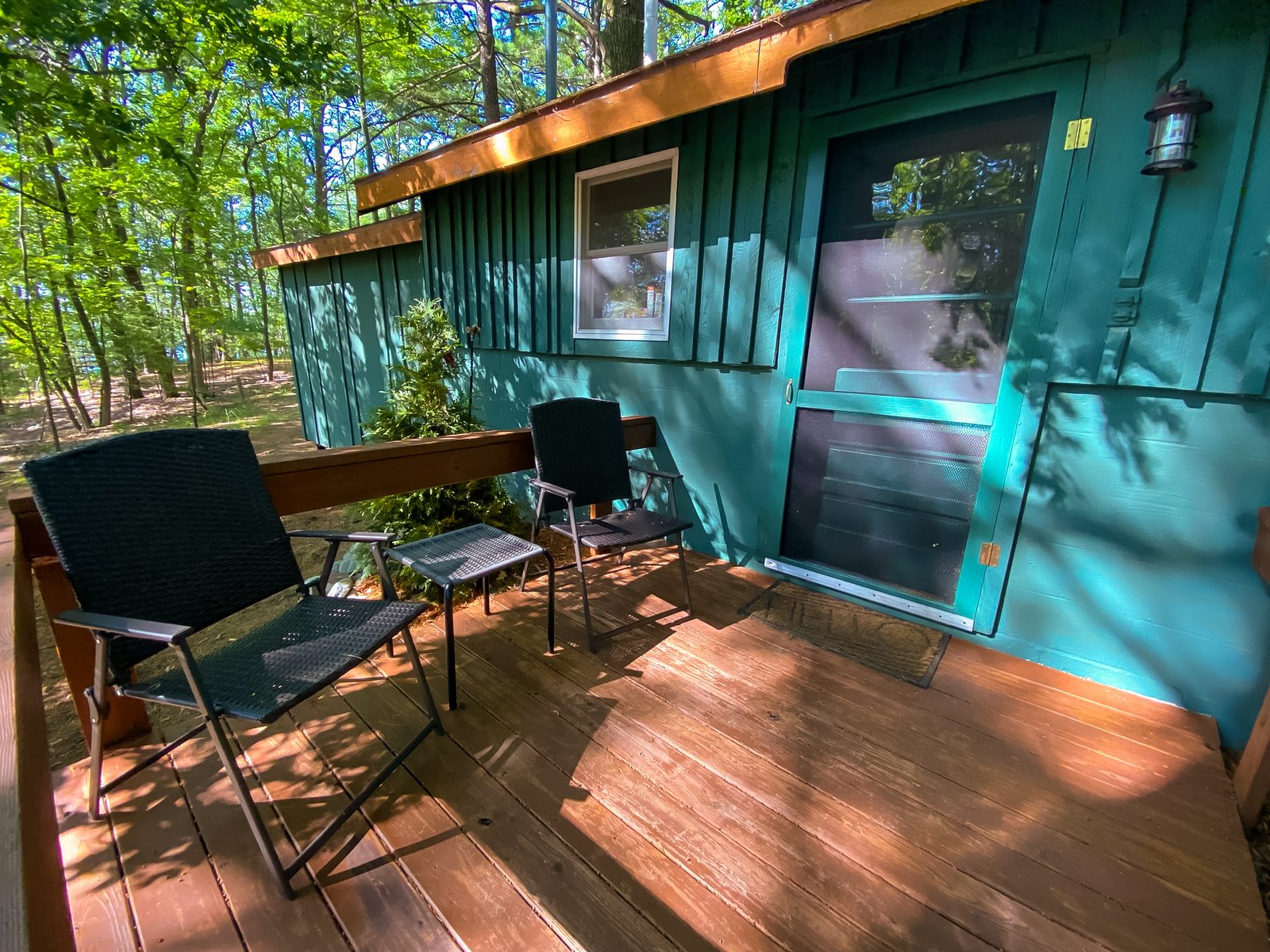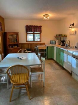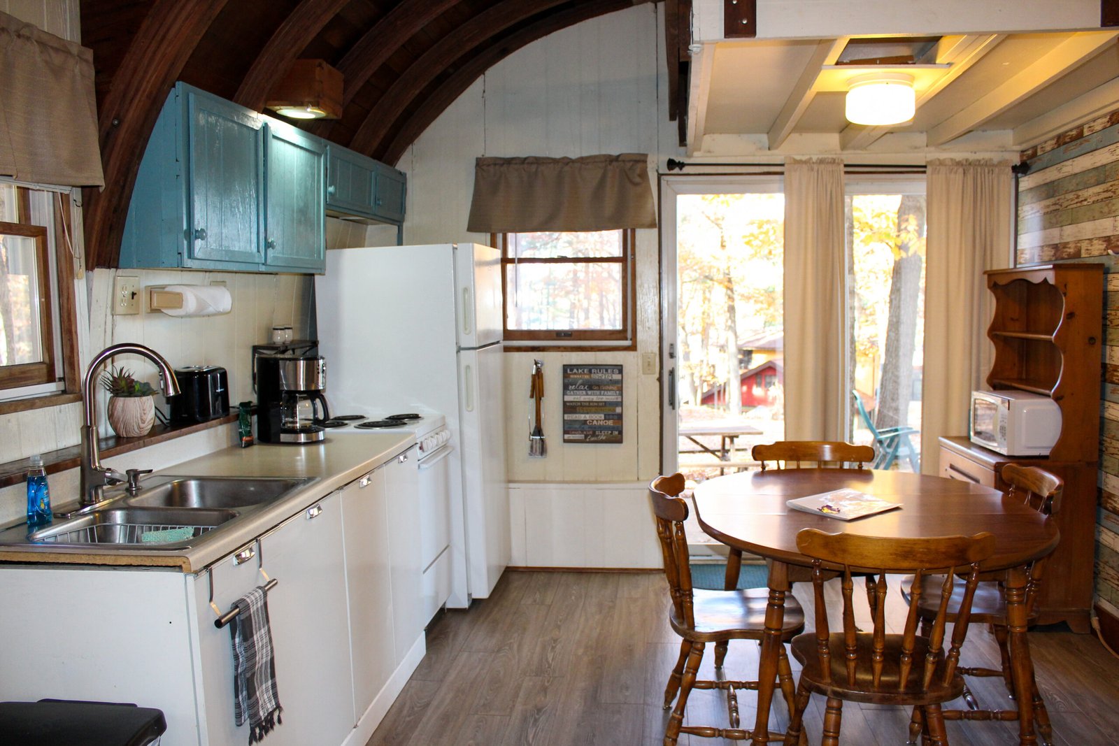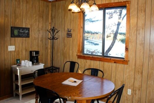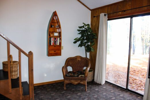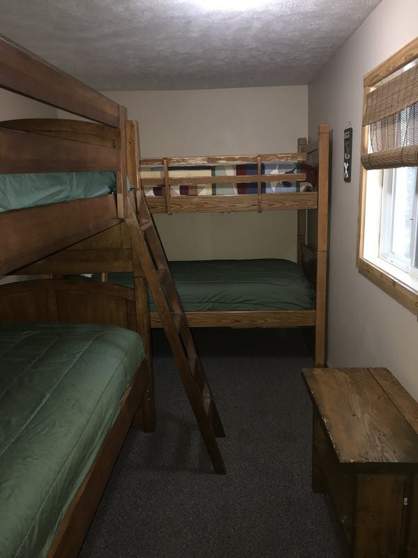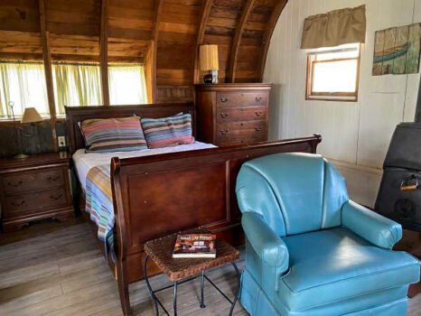 Cute and cozy, yet very spacious with air conditioning. Enters into the living room with Queen bed and wood burning stove. Eat-in kitchen with double size loft bed above. Bathroom with shower. Sliding glass doors off kitchen lead to the patio with picnic table, grill, and private fire pit. Approximately 350 feet from the lake.