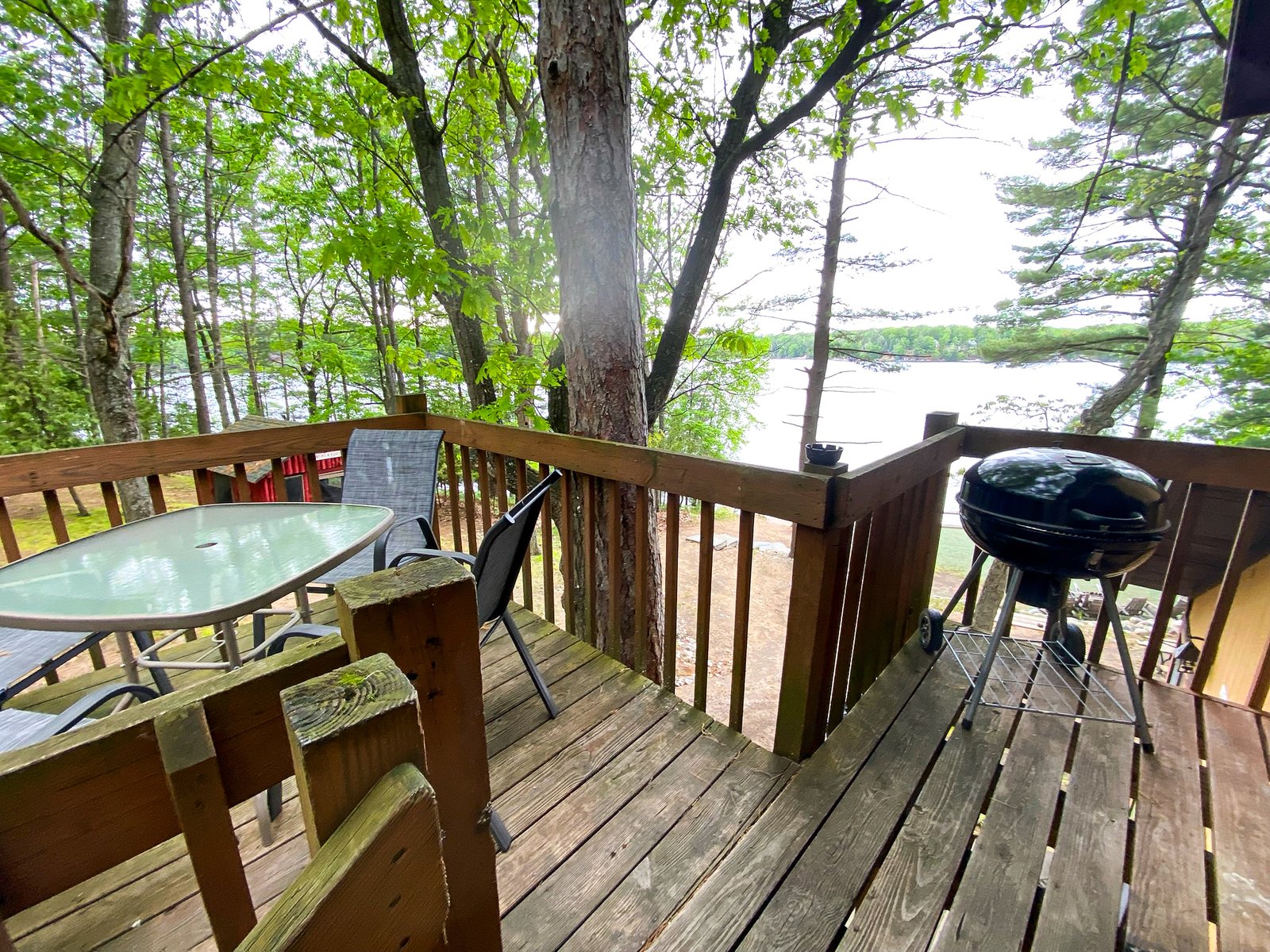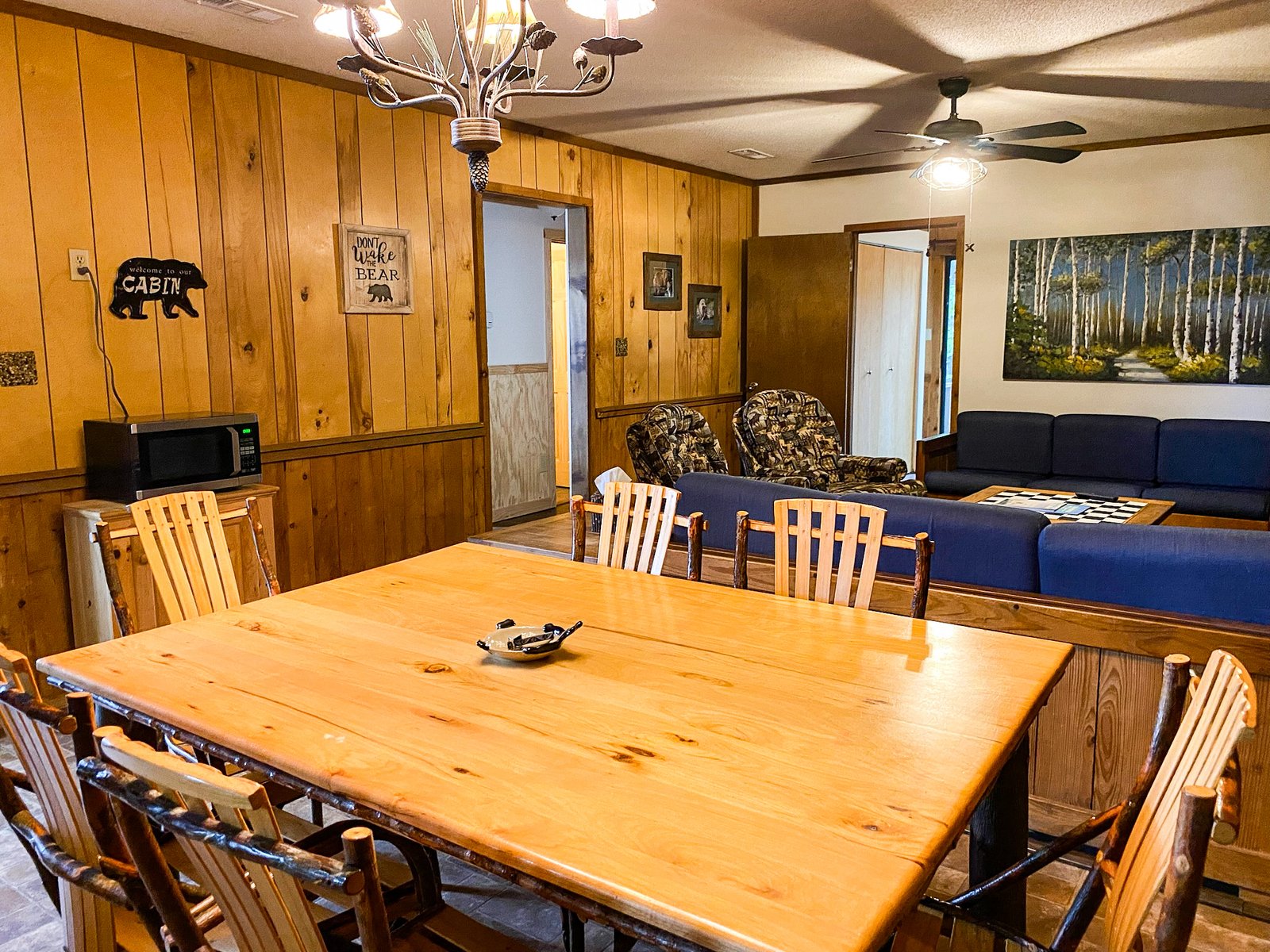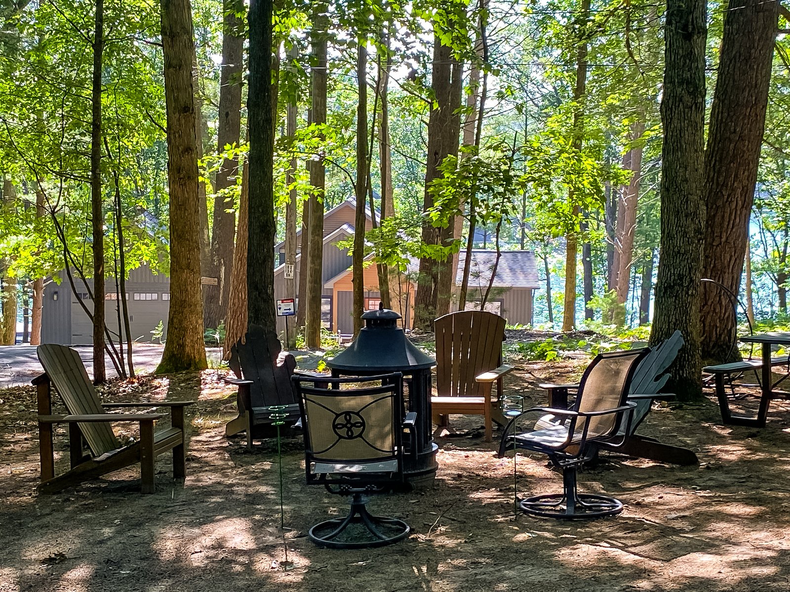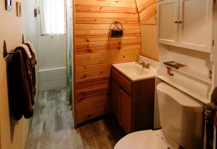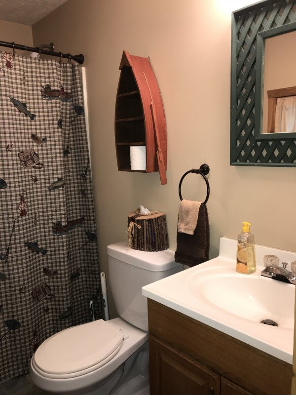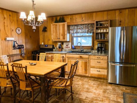Cute and cozy, yet very spacious with air conditioning. Enters into the living room with Queen bed and wood burning stove. Eat-in kitchen with double size loft bed above. Bathroom with shower. Sliding glass doors off kitchen lead to the patio with picnic table, grill, and private fire pit. Approximately 350 feet from the lake.