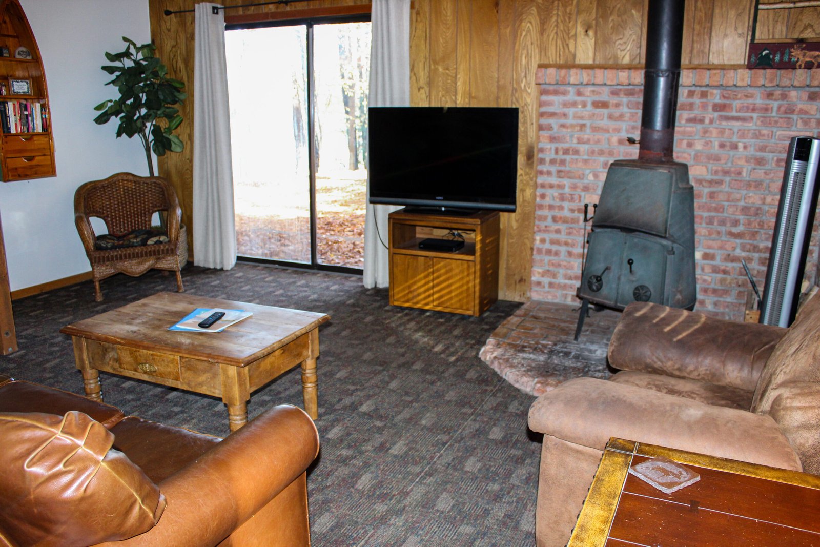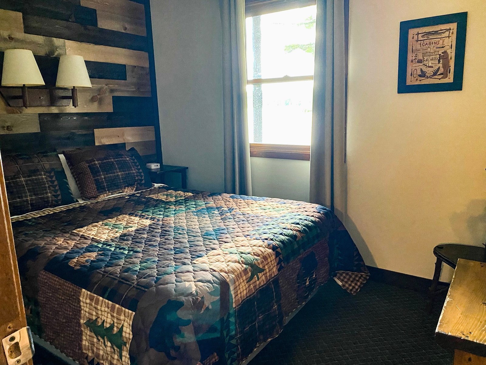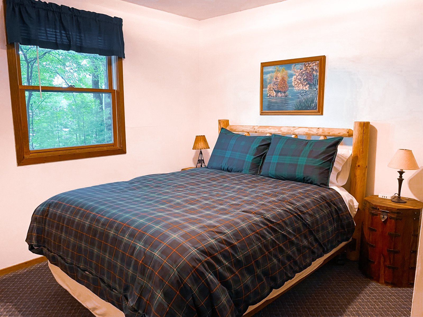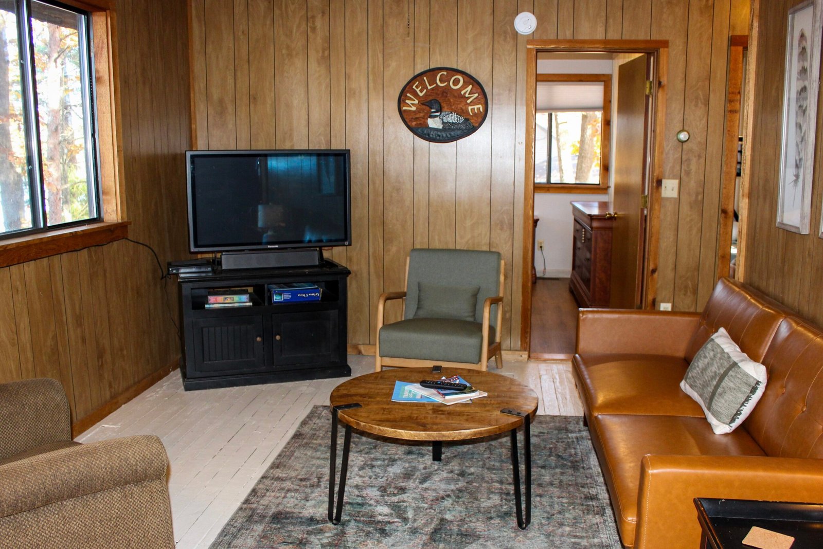 Cute and cozy, yet very spacious with air conditioning. Enters into the living room with Queen bed and wood burning stove. Eat-in kitchen with double size loft bed above. Bathroom with shower. Sliding glass doors off kitchen lead to the patio with picnic table, grill, and private fire pit. Approximately 350 feet from the lake.